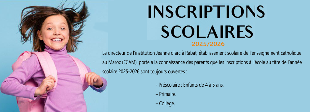 · Préscolaire : adjointe.direction.prescolaire@jeannedarc.ma Tel : 0537672315